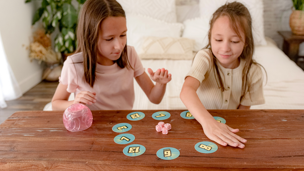 COUNTING AND MATCHING ADDITION CARD GAME: A fast-action dice and card game where players race to add up the values on the rolled die then snatch the matching numbered playing cards. One die value can also be matched with one card value.