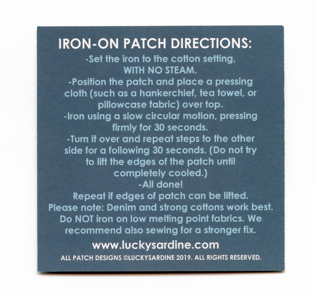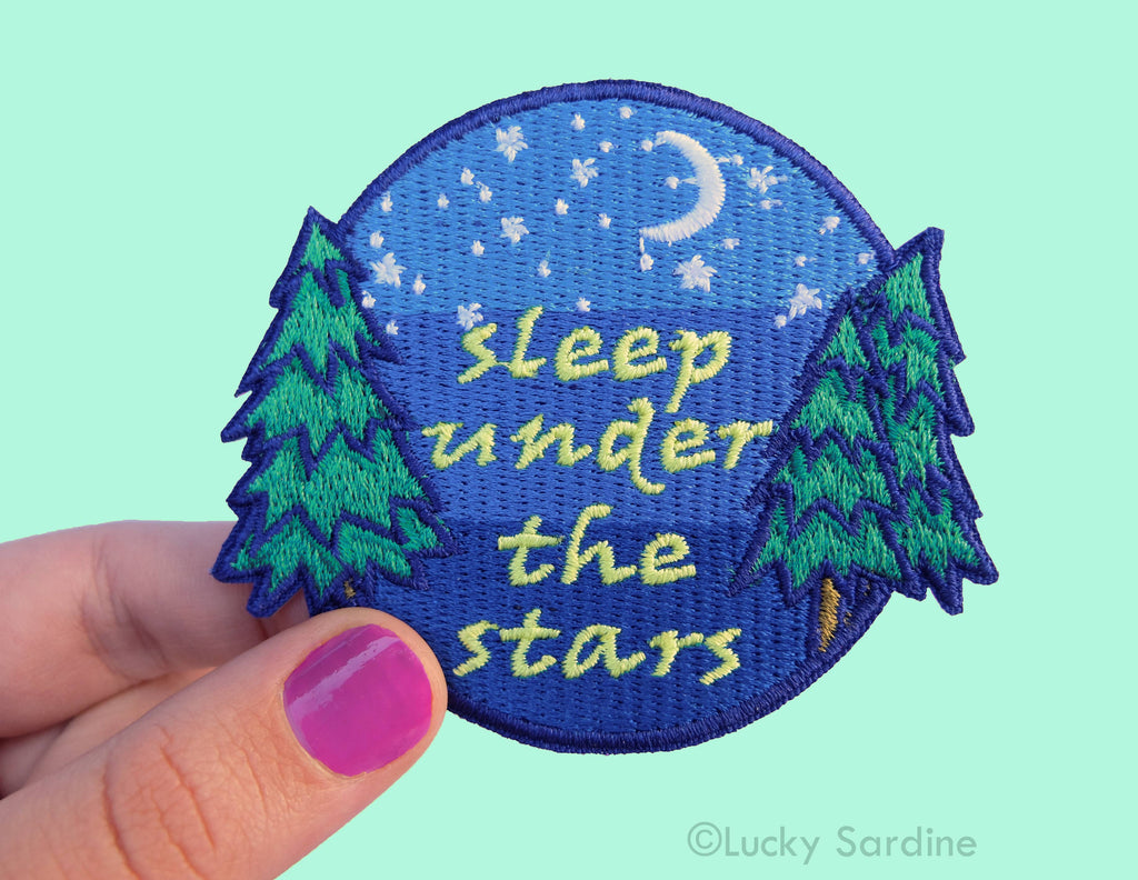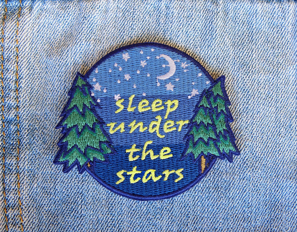 Our Sleep Under The Stars iron-on patch is 3.1" wide by 2.6" tall. It's a cinch to apply and adds a fun touch to any outfit. Get outdoors in style!