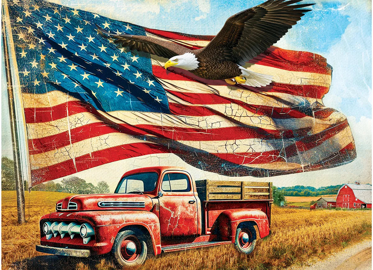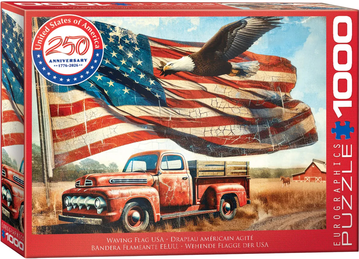 Celebrate freedom, heritage, and enduring pride with Waving Flag USA, a captivating 1000-piece puzzle created in honor of the 250th Anniversary of the United States of America (1776–2026). This powerful scene features a majestic American flag billowing across an open rural landscape, accompanied by a soaring bald eagle—an enduring symbol of strength and liberty.