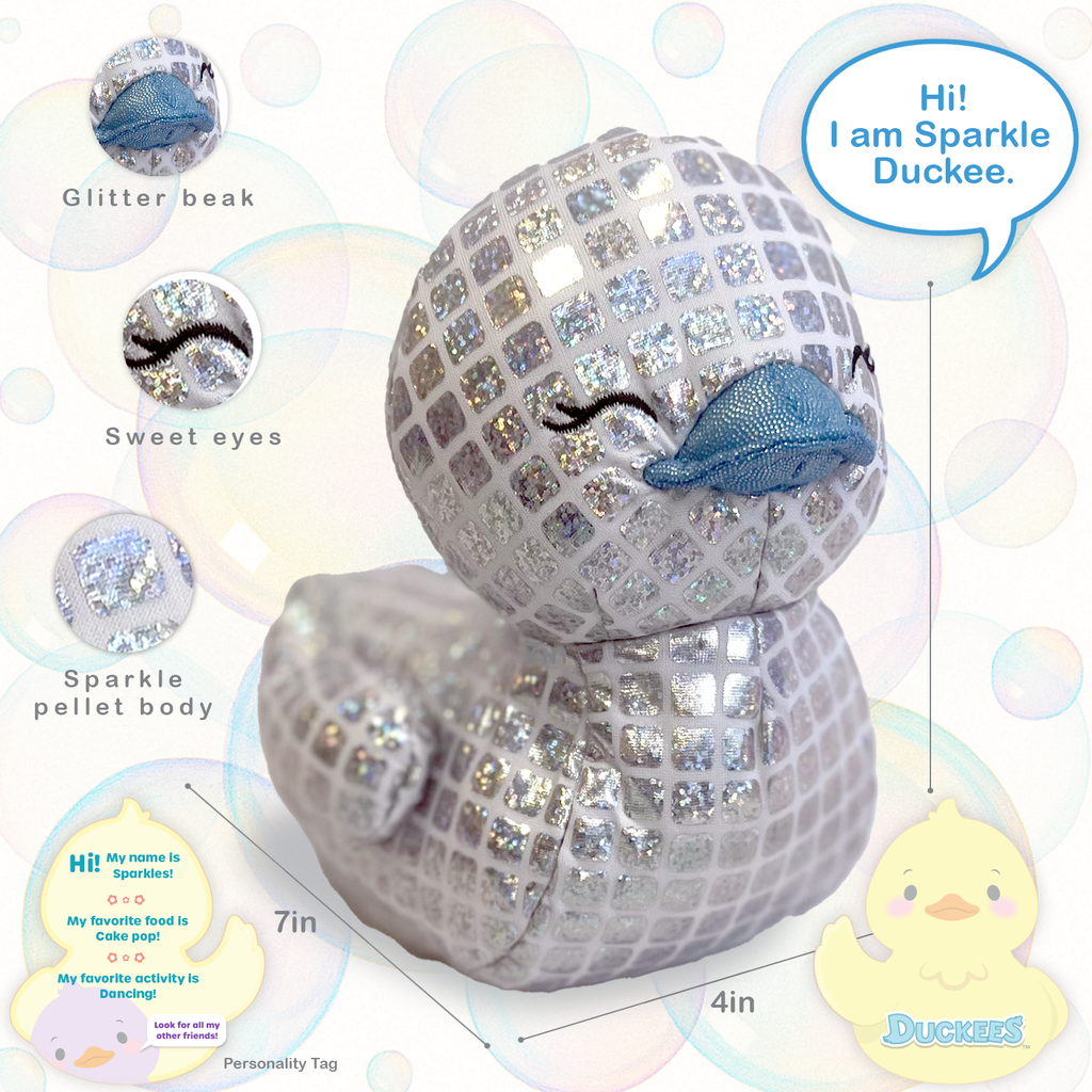 Meet Sparkles, the dancing Duckee Highlandee who loves to twirl, shine, and spread joy! This 7" plush pal is soft, squishy, and full of personality. Designed in the USA and crafted with love and care, Sparkles brings happiness, comfort, and charm to every cuddle. Includes 1 piece: 7" Sparkles Plush Duckee Highlandee. Hi, my name is Sparkles! My favorite activity is dancing and making everyone smile! Perfect for kids, collectors, and anyone who loves cute, twinkly friends. Great for Holiday Gifting, stocking stuffers, or boutique displays. Add Sparkles to your shelves and dance into smiles this Christmas 2025!