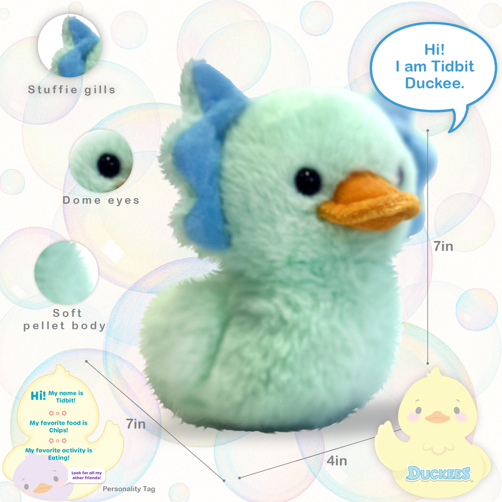 Meet Tidbit, the adorable Duckee Axolotl who loves chips and snack time fun! This 7" plush pal is soft, squishy, and always ready for cuddles. Designed in the USA and crafted with love and care, Tidbit brings cozy comfort, smiles, and a splash of underwater charm to every hug. Includes 1 piece: 7" Tidbit Plush Duckee Axolotl. Hi, my name is Tidbit! My favorite food is chips, and I love eating all day! Perfect for kids, plush fans, and collectors who love cute aquatic friends. Great for Holiday Gifting, stocking stuffers, or boutique displays. Add Tidbit to your shelves and make snack time extra cuddly this Christmas 2025!